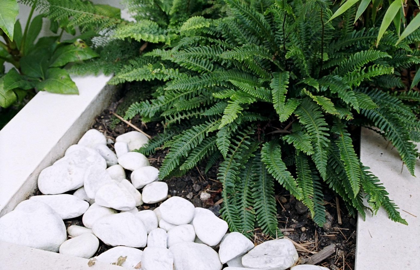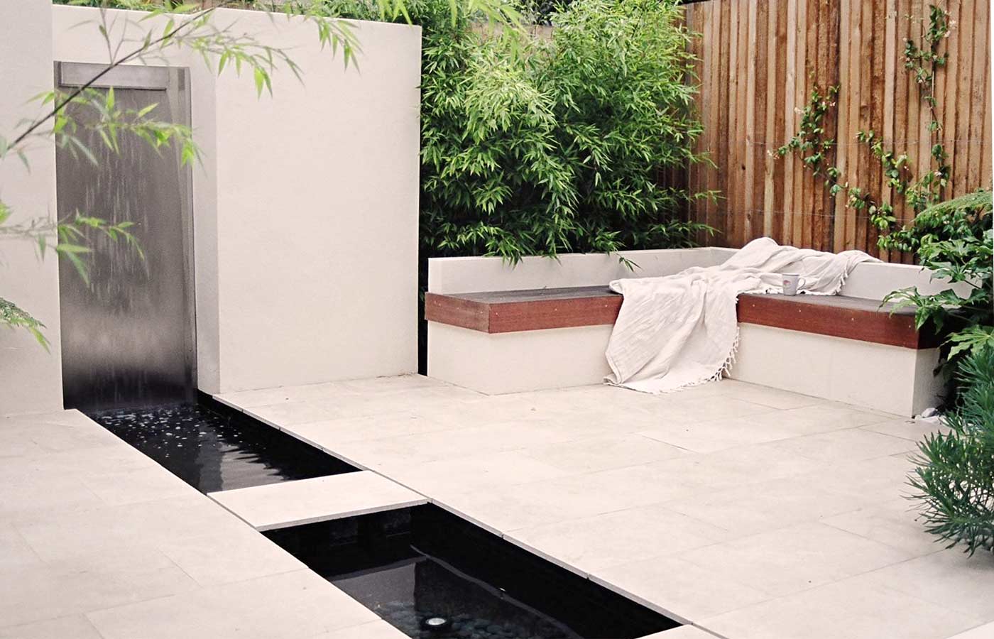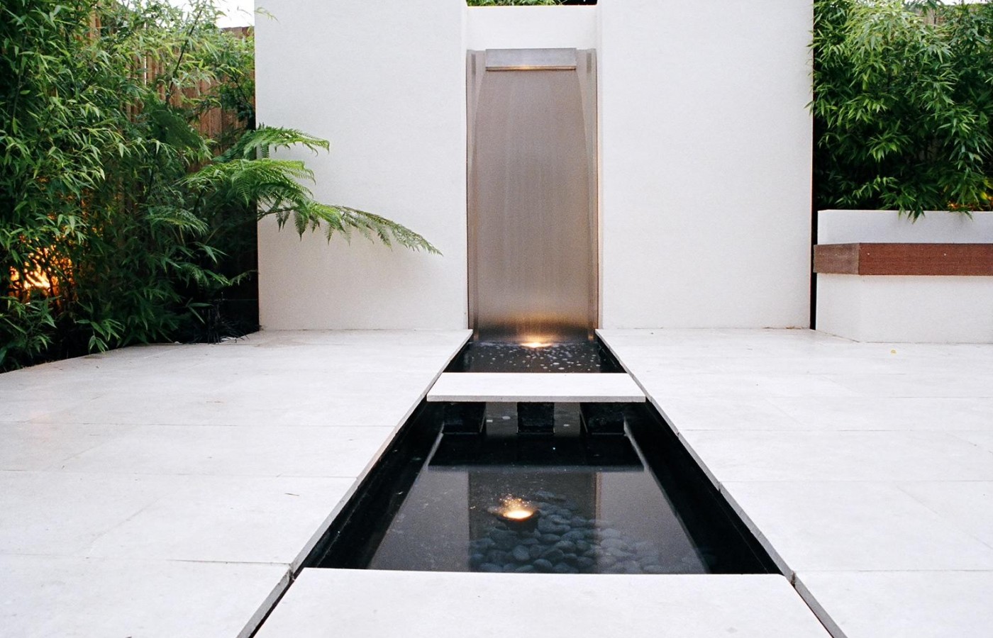 Small rear garden design in St. Albans, Hertfordshire, with white limestone, recessed lighting, water channel and cascade, and evergreen structural planting. Trees, ferns, bamboo, pittosporums, white agapanthus help to create the lush rain forest atmosphere the clients wished for.