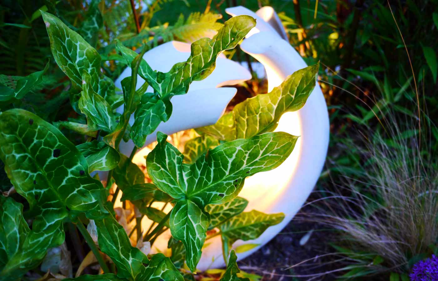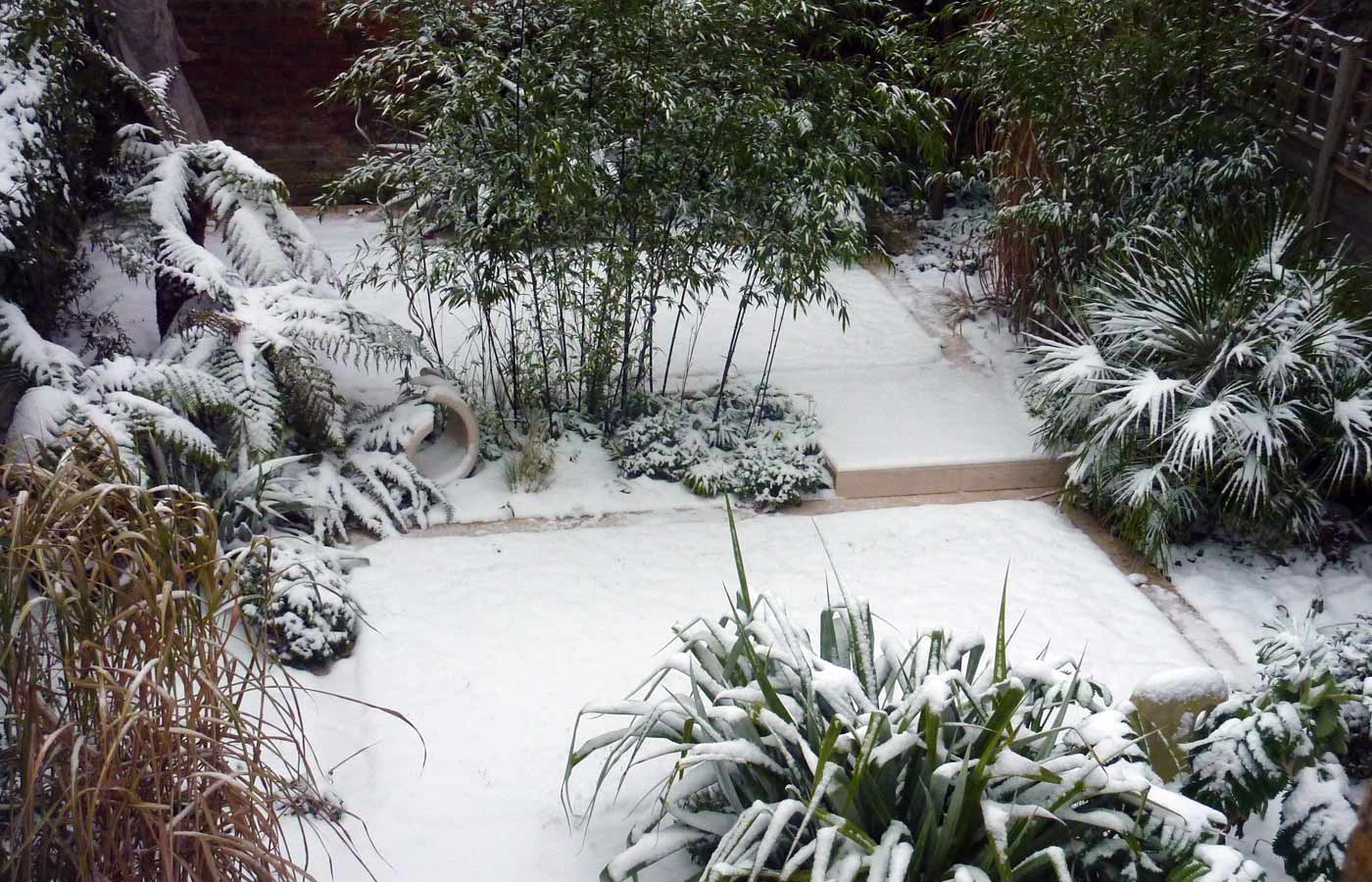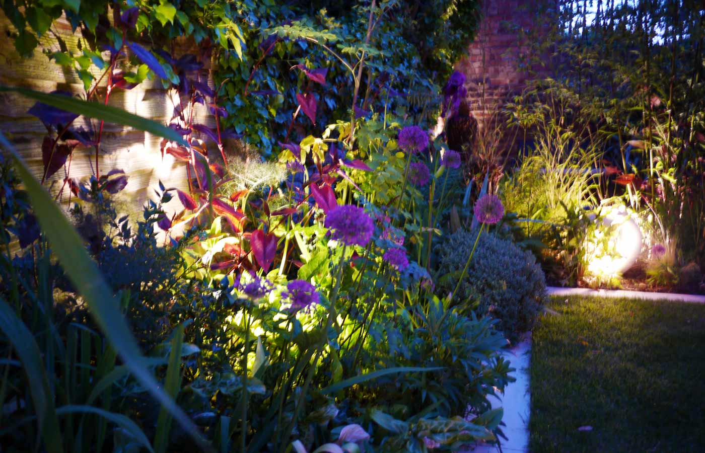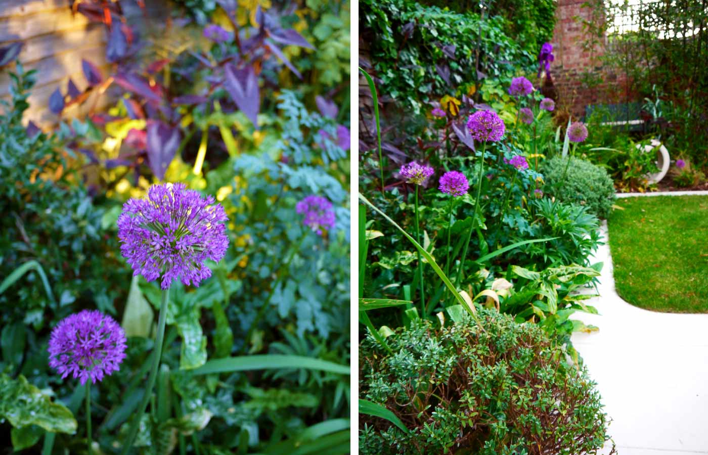 The garden is white in winter and early spring with hellebores, sarcococca, narcissus, leucojum; then changing to purple and blues in later spring from alliums, tulips, camassia, thalictrum and iris. Summer into autumn sees burgundy colouring of acanthus, persicaria with fresh white agapanthus and anemones.