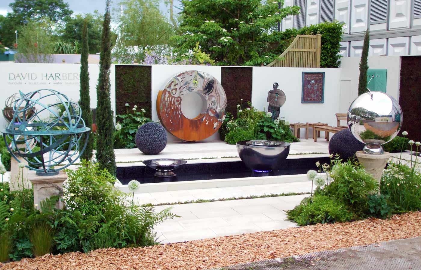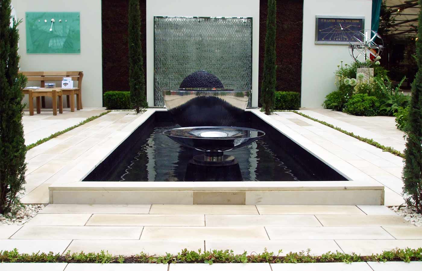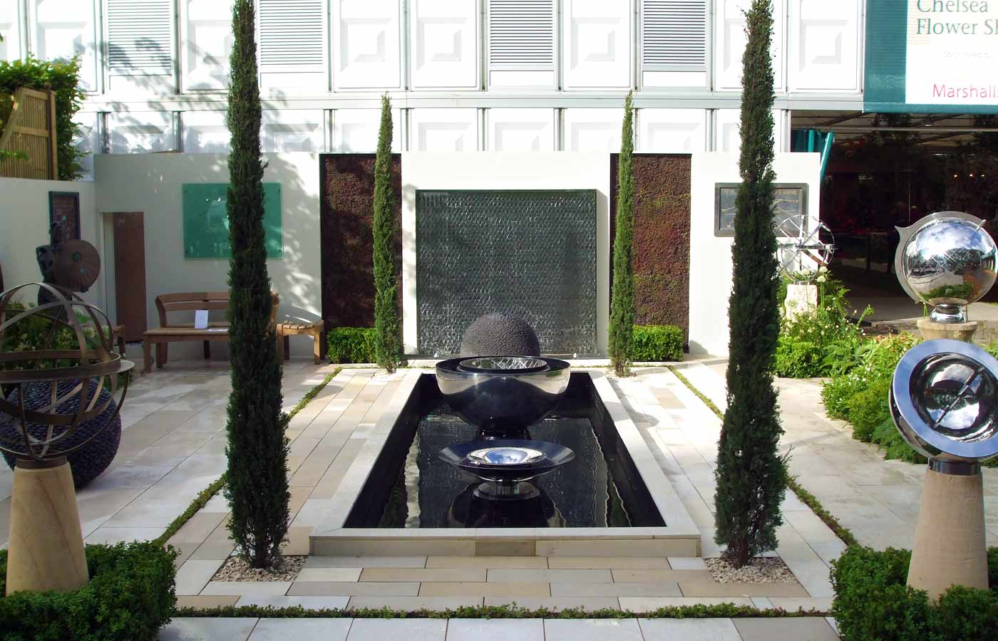 Echinops Garden Design’s fourth exhibition stand design for garden artist David Harber at the RHS Chelsea Flower Show took a different approach from the earlier natural informal designs, opting for an elegant, classical style. Two tall sundials flank a water rill containing three aligned water features, which leads the eye to a water wall beyond.