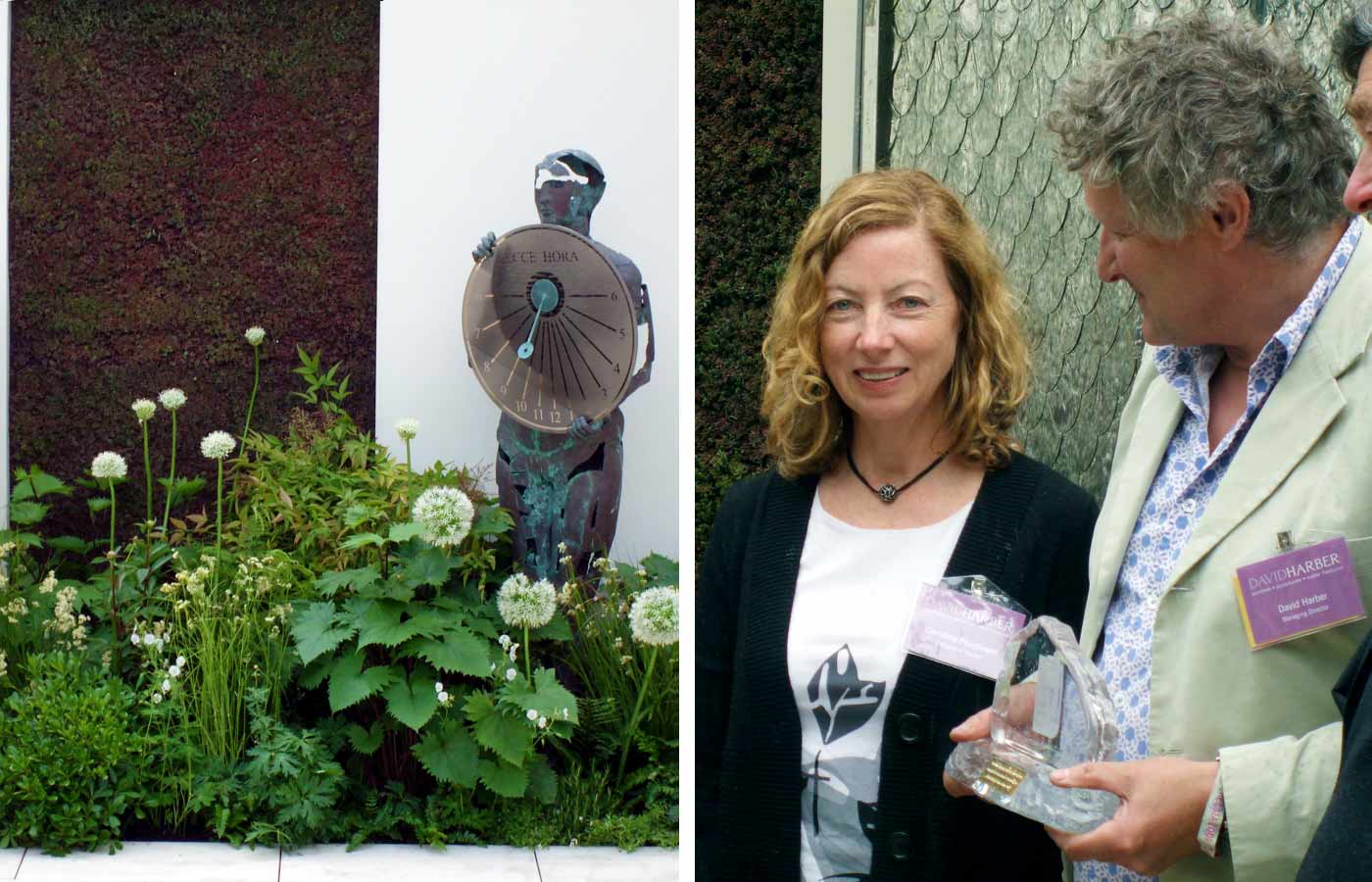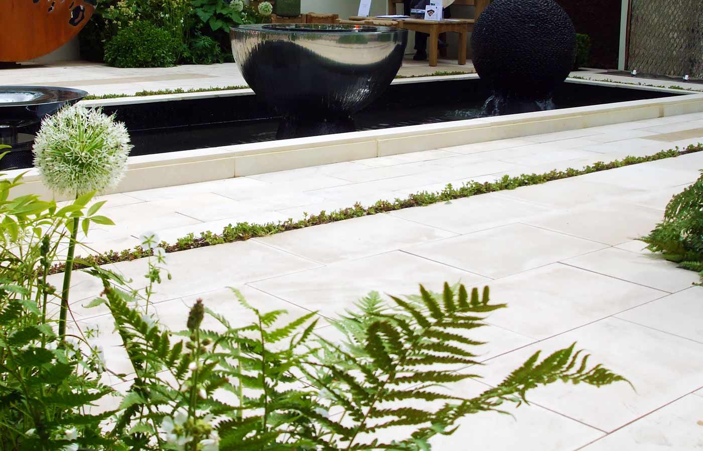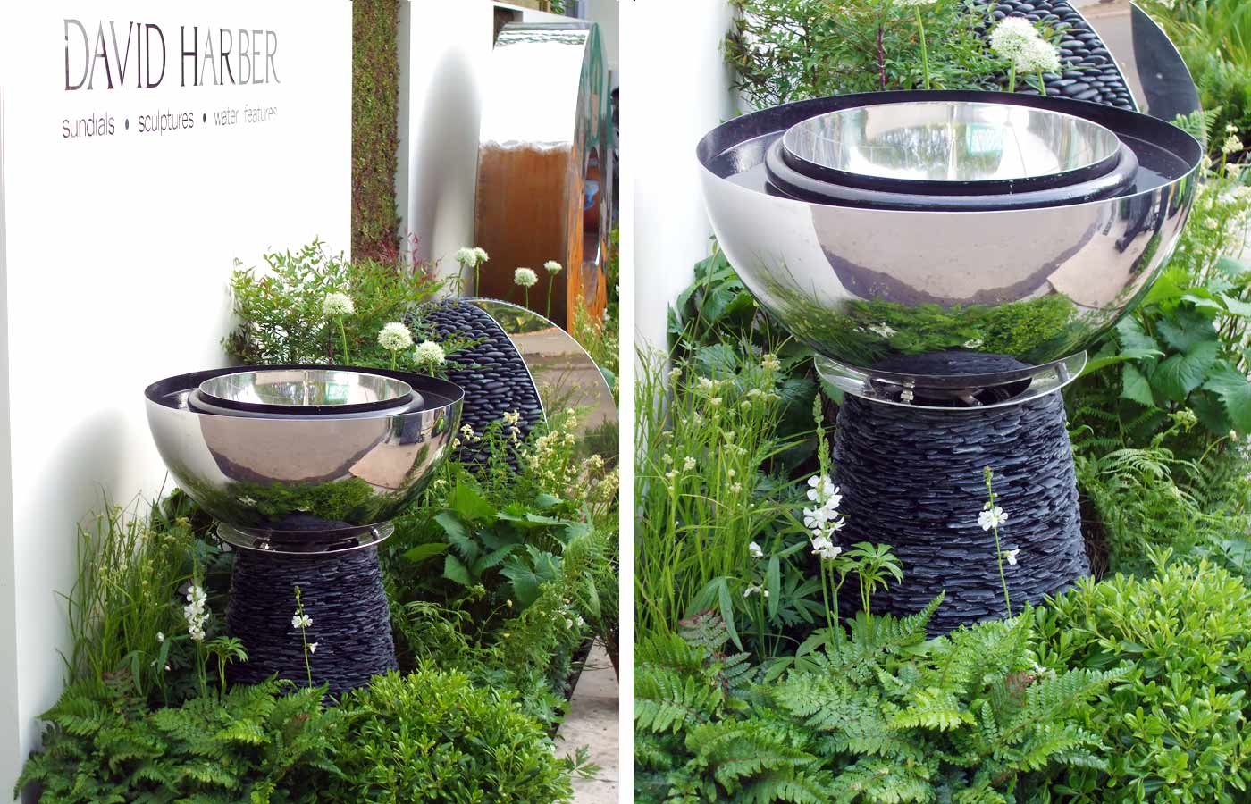 Echinops Garden Design’s fourth exhibition stand design for garden artist David Harber at the RHS Chelsea Flower Show took a different approach from the earlier natural informal designs, opting for an elegant, classical style. Two tall sundials flank a water rill containing three aligned water features, which leads the eye to a water wall beyond.