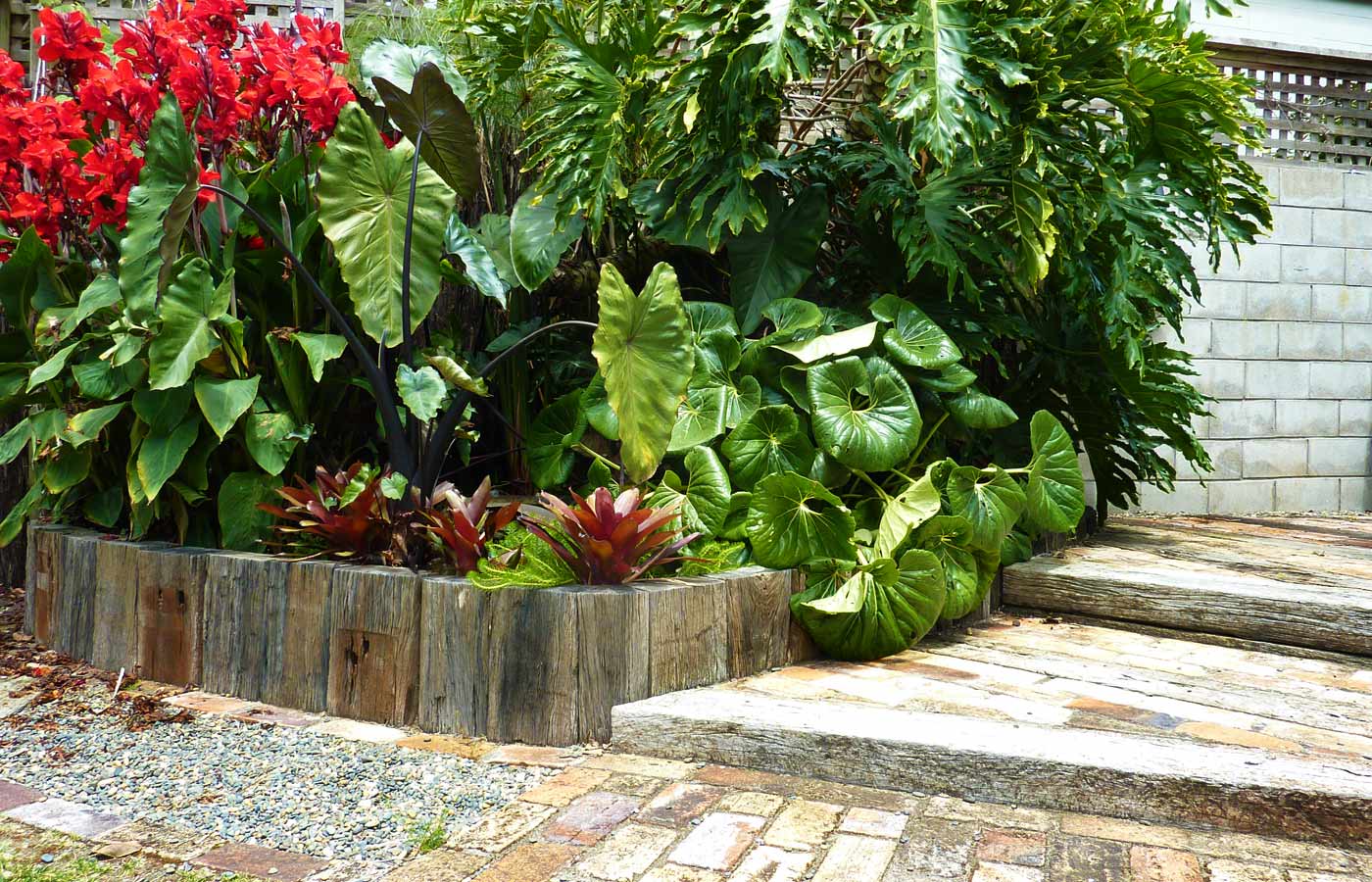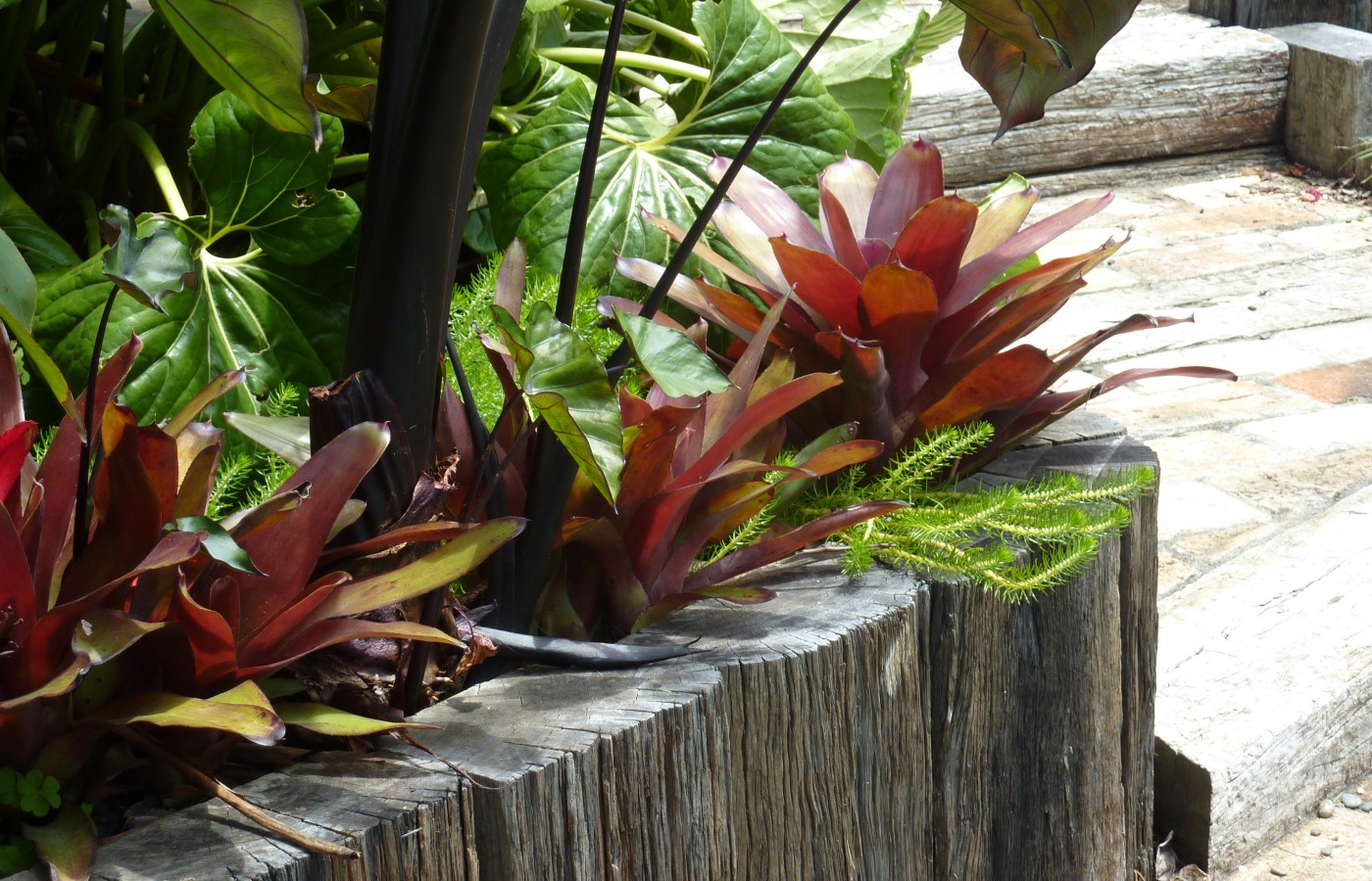 Recycled materials, sub-tropical plants, water, and sculpture combine to create an enclosed haven in this Auckland garden. Recycled timber beams and brick are used as a paving surface and mixed with gravel for paths. The same timber forms walls for the planting areas. Lush planting of natives such as astelia, phormium and carex mix with colourful canna, colocasia, bromeliads, and hibiscus. New Zealand sculpture, tinkling water and lighting complete the garden.